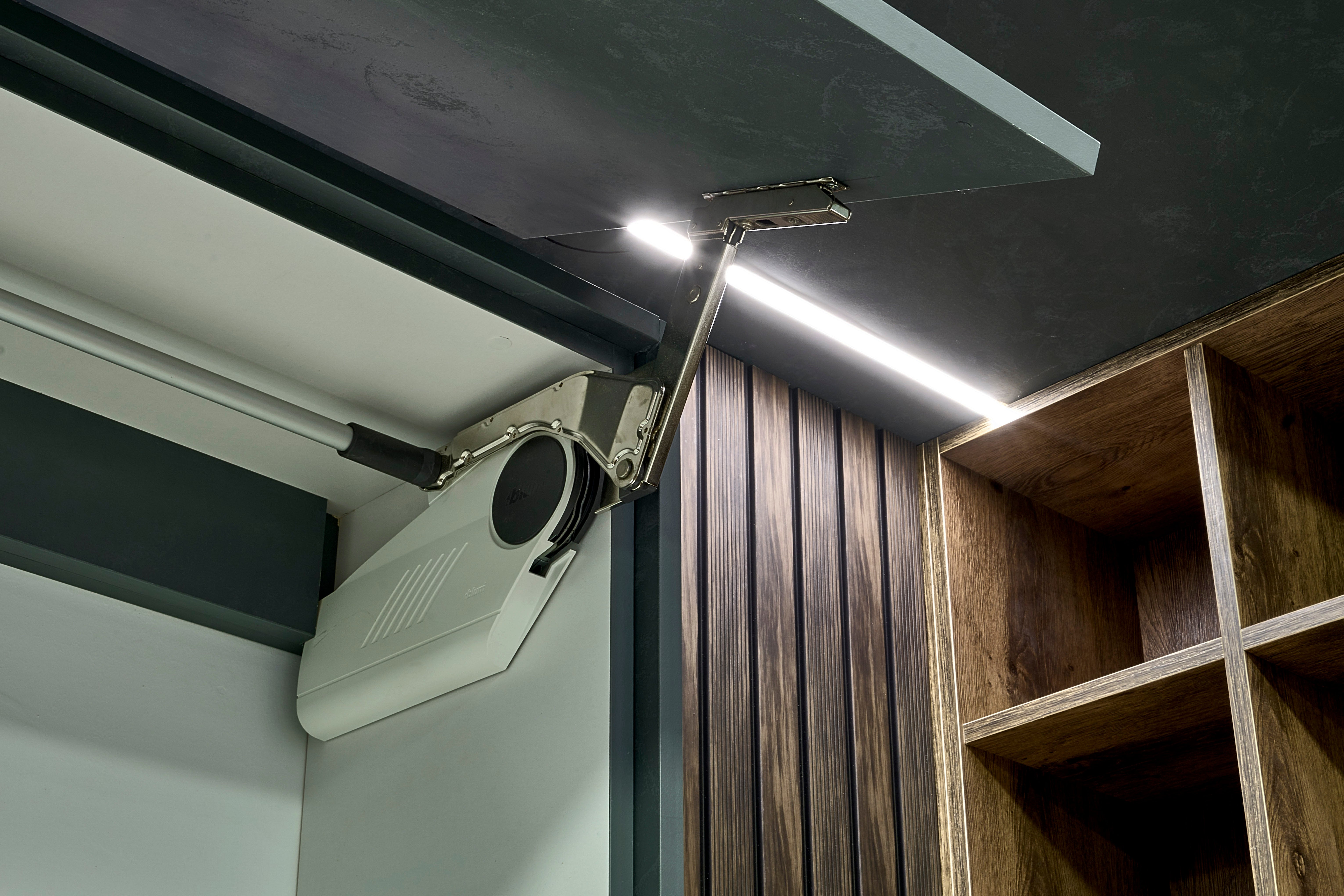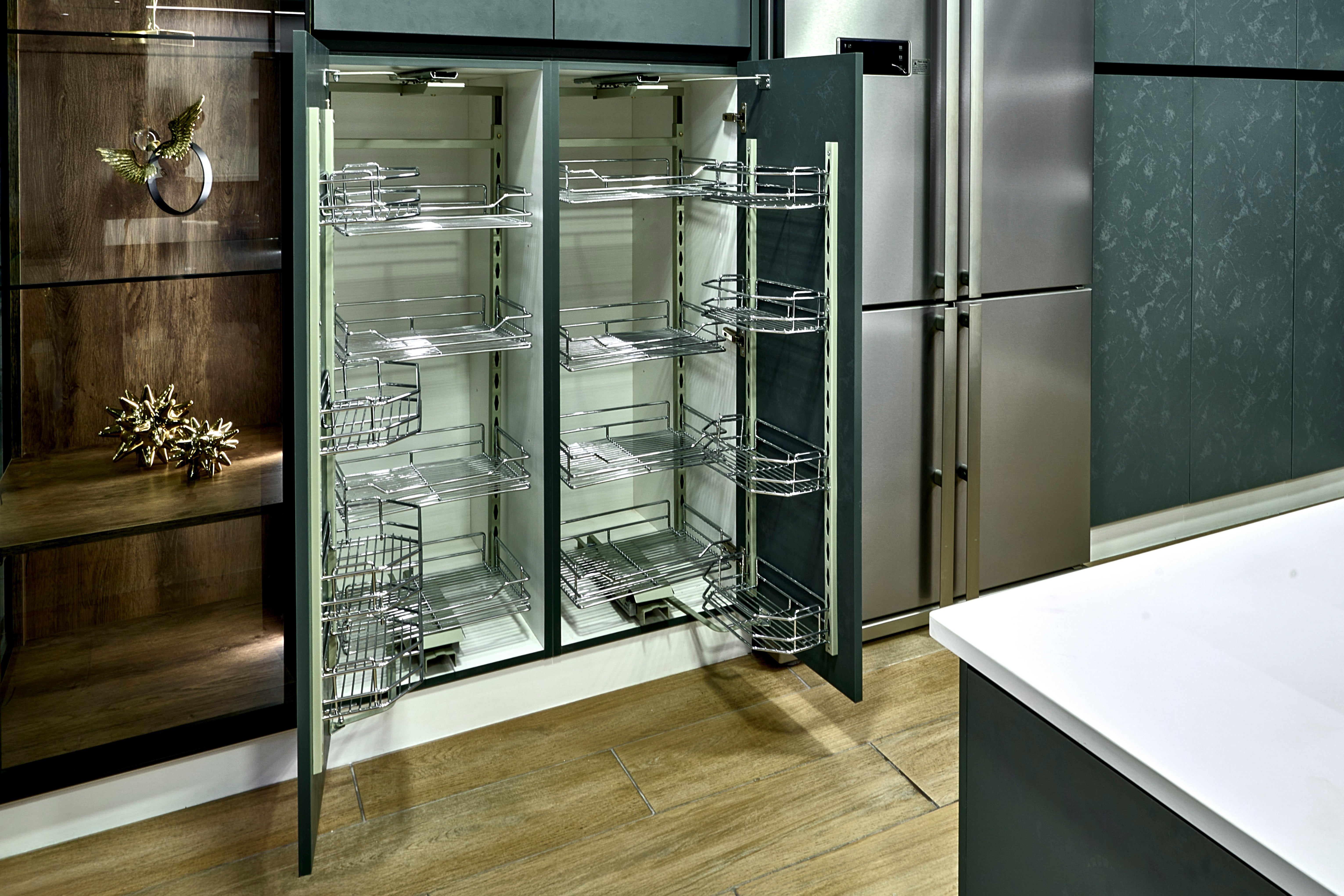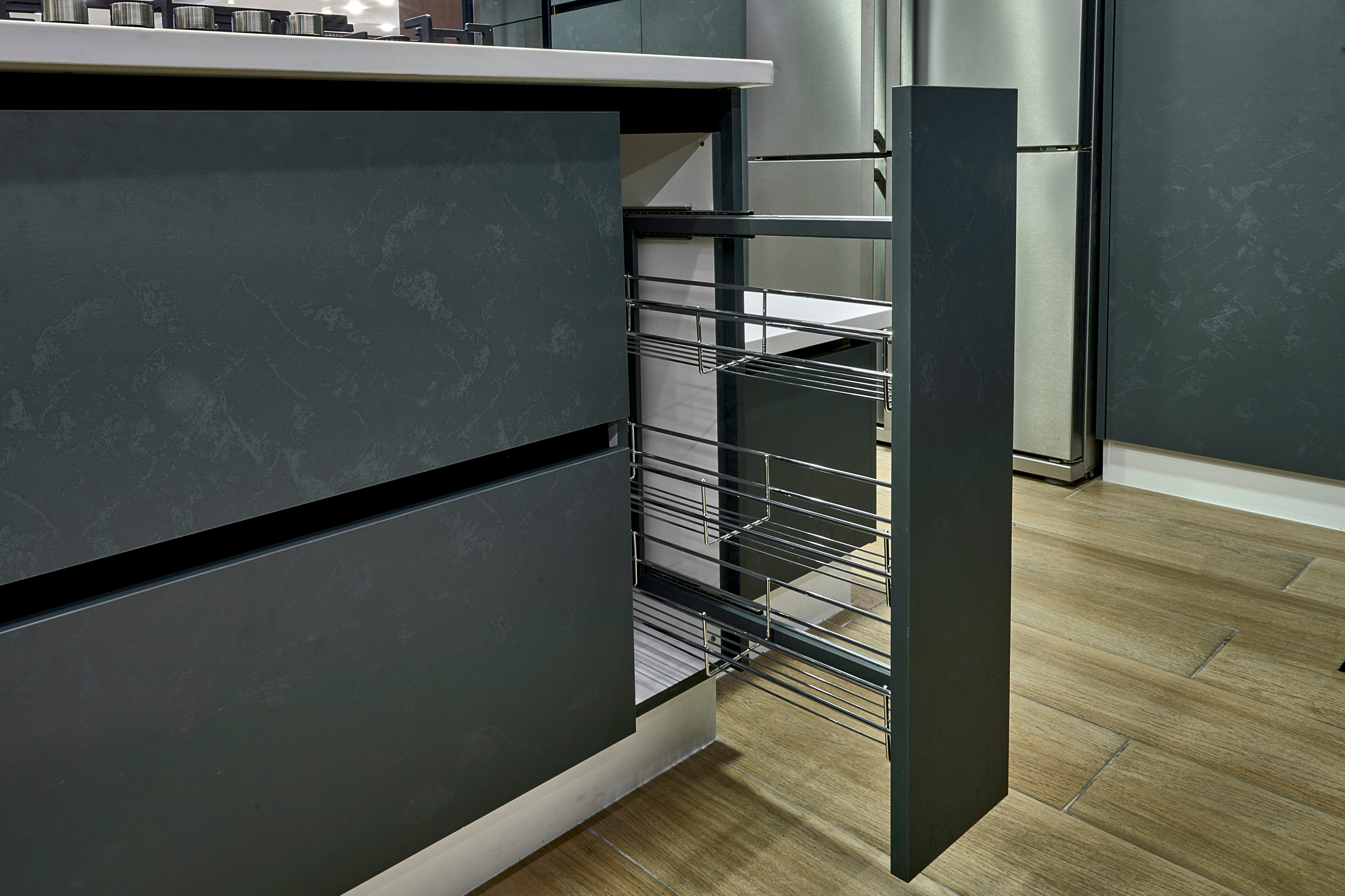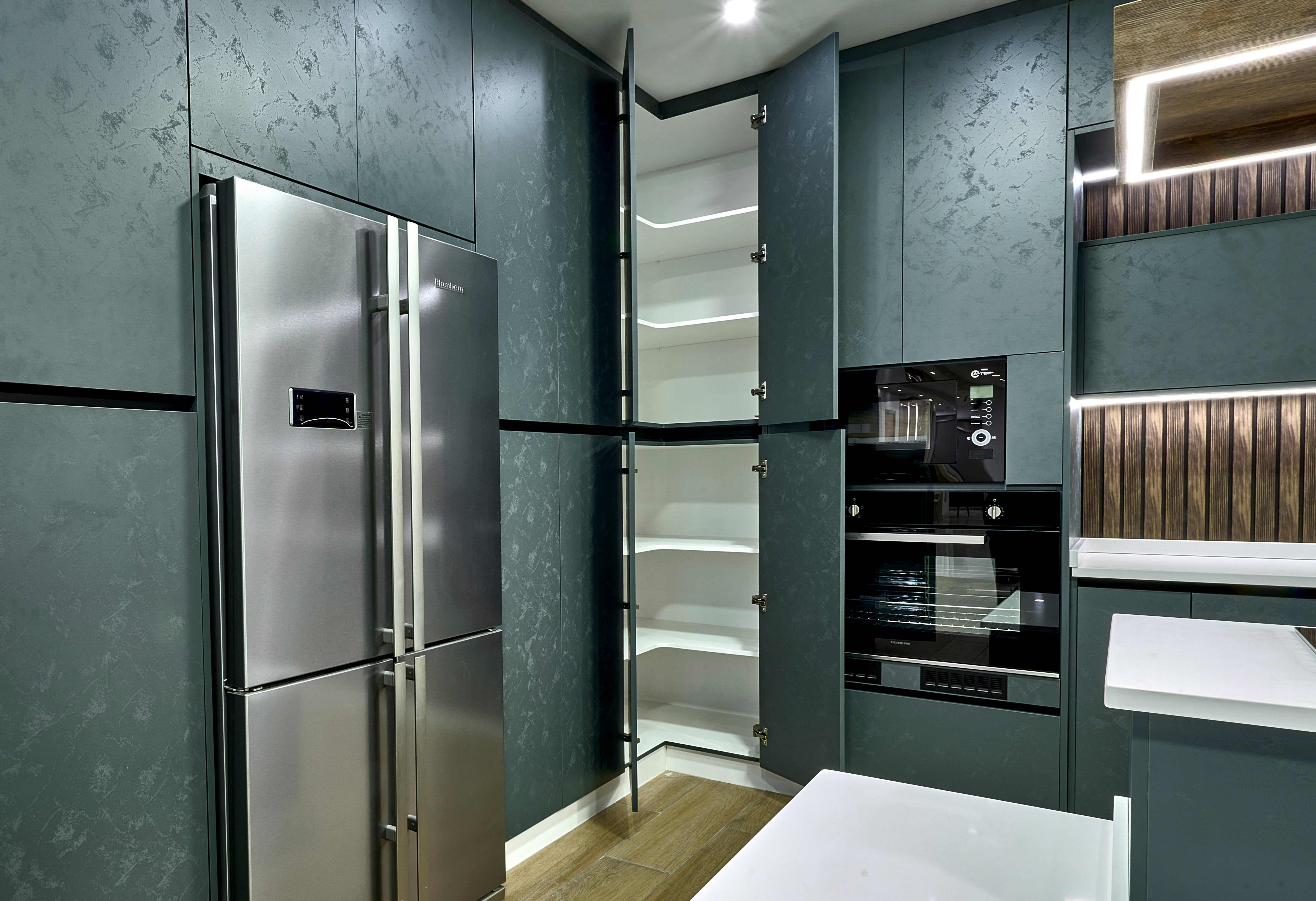 Olive Edge is a modern laminate kitchen design characterized by a bold olive green color, combined with innovative design touches that give the kitchen a unique personality. This design merges contemporary elegance with a daring use of color, where the olive shade adds warmth and sophistication. The layout features unconventional shapes and creative storage solutions, making it perfect for those seeking a distinct and standout kitchen that complements bold colors and modern aesthetics.
