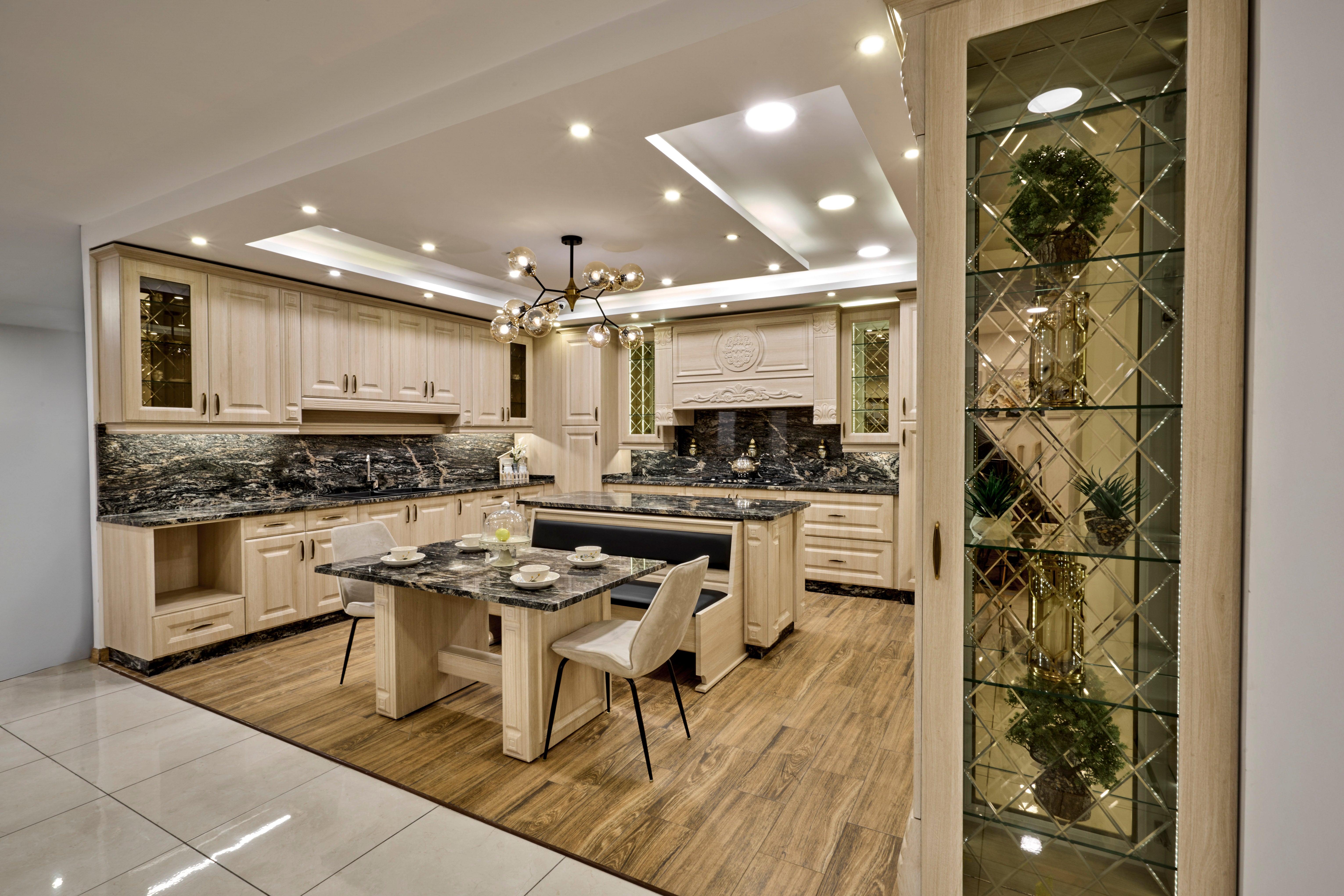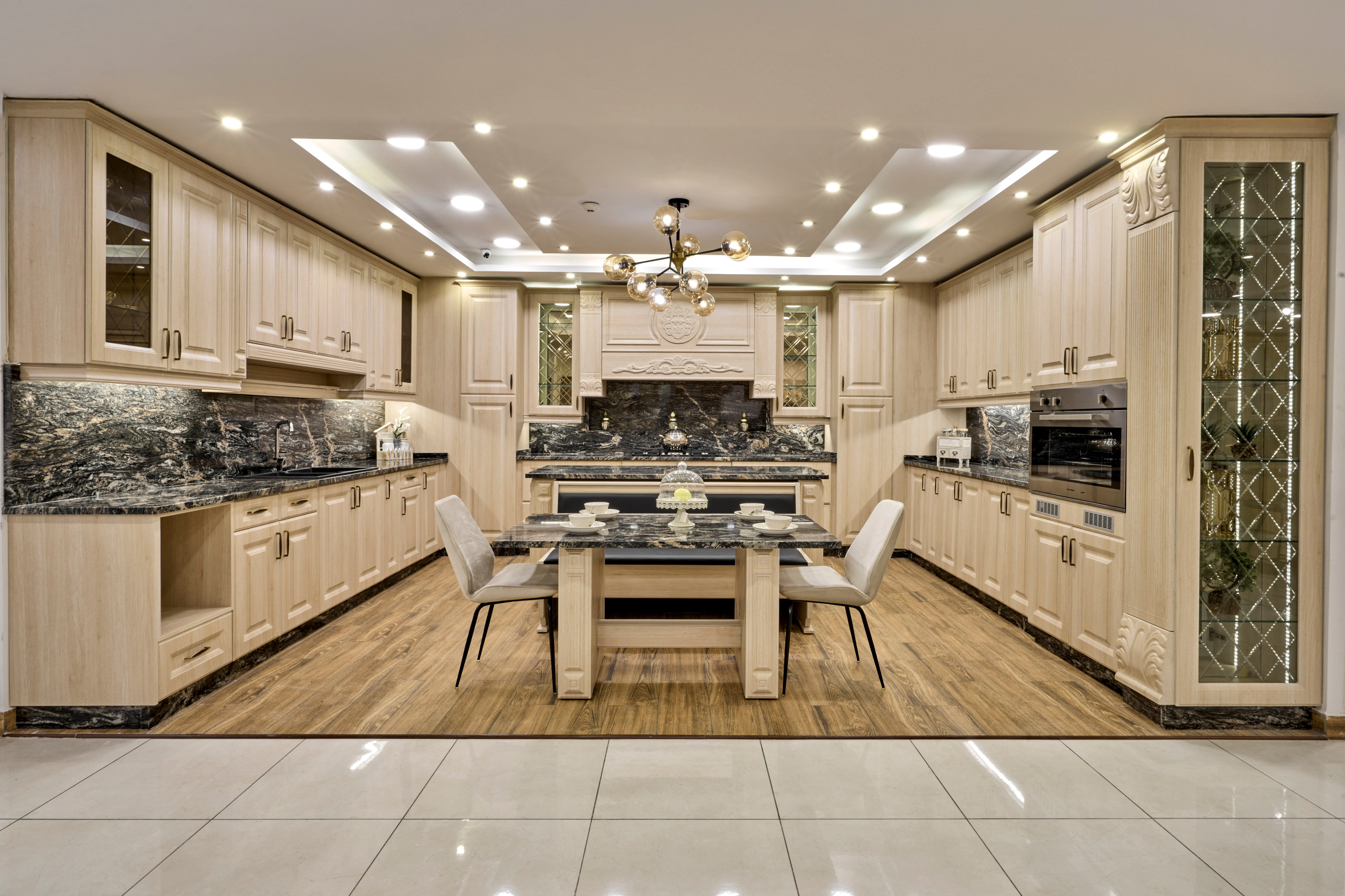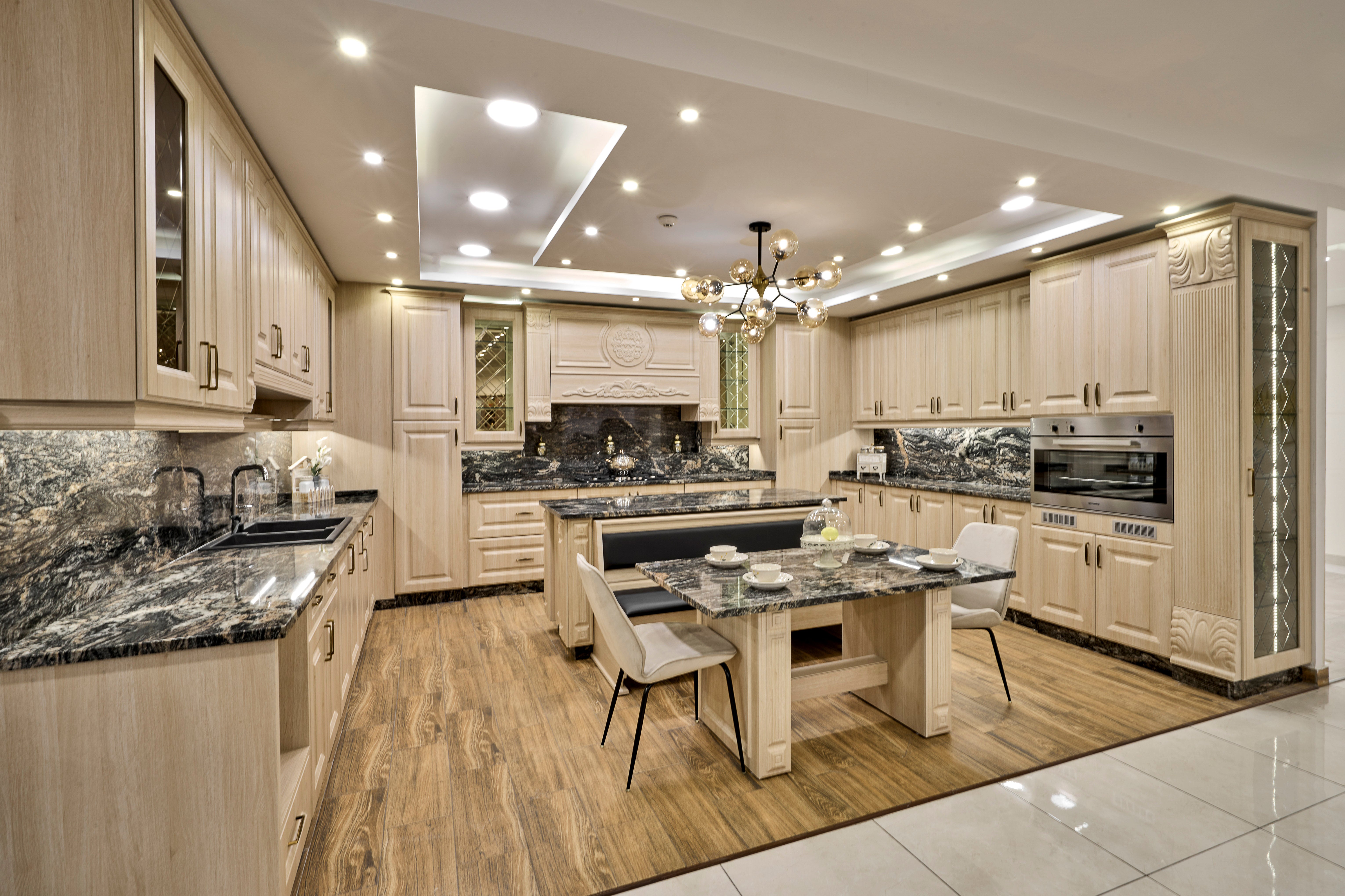New Classic PVC Kitchen combines the timeless elegance of classic design with modern materials and technologies, offering a perfect balance between style and practicality. The concept behind a new classic kitchen is to maintain the beauty and grace of traditional styles, while integrating the durability and functionality of contemporary materials like PVC (polyvinyl chloride). This type of kitchen design focuses on sophisticated aesthetics and long-lasting performance.